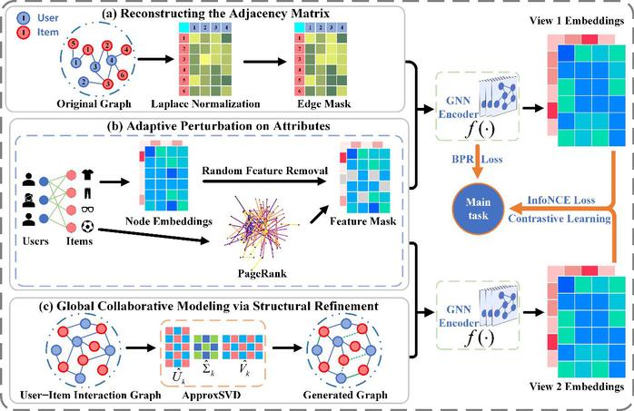 在推薦系統中,用戶-物品二部圖的原始數據質量直接影響推薦效果,因此如何構造高質量的增強圖表示,同時保留原始語義信息,是圖對比學習領域亟待解決的核心問題。圖增強策略作為提升圖對比學習模型魯棒性的關鍵技術,已廣泛應用于推薦系統。然而,現有方法多采用隨機啟發式增強策略,這可能會引入偏差性噪聲,并在LightGCL傳播過程中進一步放大,進而影響推薦效果。
