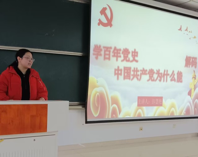 彭慧艷老師圍繞百年黨史,以“中國共產黨為什么能”這一主題進行發言。她從中國共產黨的豐功偉績出發,講述中國共產黨在馬克思主義的帶領下茁壯成長,最終建立新中國的輝煌歷史,論述了馬克思主義對中國共產黨的的重要意義。