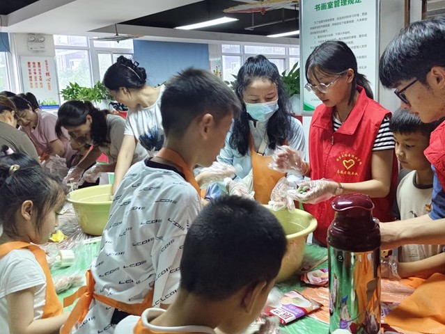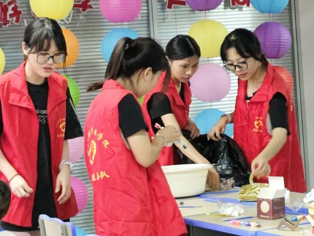 9月11日下午3:40,志愿者們抵達竹園社區開展中秋游園會活動。在負責人的引領下,志愿者們各司其職,確保現場秩序井然,并協助孩童制作中秋月餅、進行扎染和繪制月球燈,為他們編織了歡樂與溫情交織的記憶。活動結束后,志愿者們主動清理現場,保護社區的優美環境。