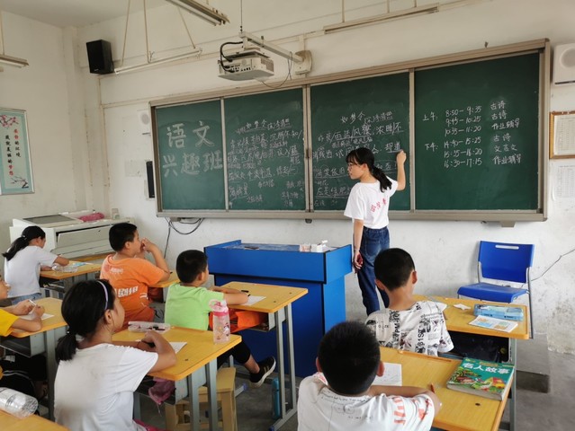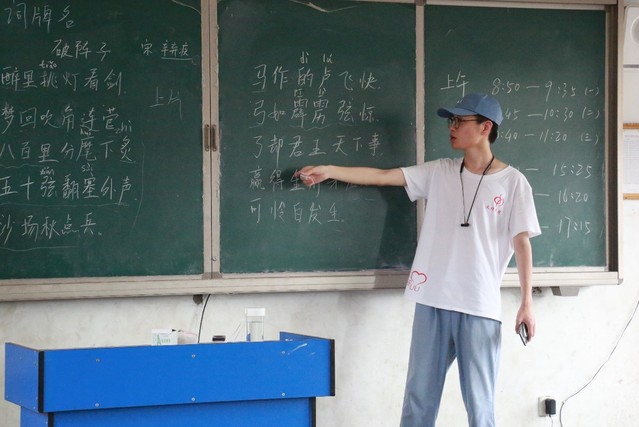此次活動(dòng)主要以授課形式進(jìn)行,三下鄉(xiāng)隊(duì)伍成員們根據(jù)每個(gè)班級的特色選擇了不同的詩詞歌賦,通過賞析詩歌進(jìn)行普通話教學(xué)。歌舞班和語文班都選擇講解宋代女詞人李清照的兩首詩歌《如夢令 昨夜雨疏風(fēng)驟歐》、《如夢令 常記溪亭日暮》。志愿者首先著重賞析了詩詞中有難度的字詞及其釋義,在字詞上標(biāo)注拼音并帶領(lǐng)孩子們進(jìn)行朗讀。接著就是逐詞逐句的分析詩歌的含義,結(jié)合時(shí)代背景與作者詳情進(jìn)一步分析詩人的內(nèi)心情感。志愿者選擇的這兩首詩歌是同一首作者不同感情,在對比中帶孩子們體驗(yàn)詩詞的優(yōu)美。在之后到武術(shù)班教學(xué)時(shí)志愿者選擇了著名愛國詩人辛棄疾的《破陣子 為陳同甫賦壯詞以寄之》,辛棄疾殺敵報(bào)國的豪情壯志和壯志未酬的憤懣不平感染了孩子們,給孩子們的心中埋下了一顆愛國的種子。