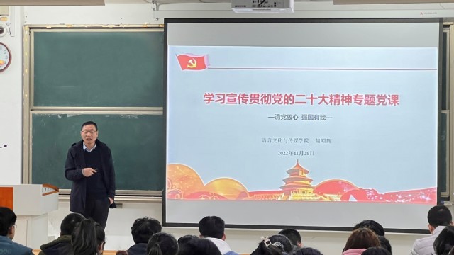 1129日中午,在一區善思樓C101教室,語言文化與傳媒學院黨委書記儲昭輝向團干部宣講黨的二十大精神,我院本期“青馬工程”培訓班全體學員及發展對象到場聆聽。