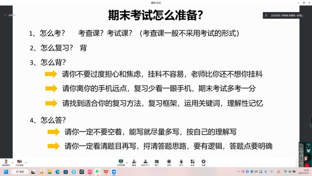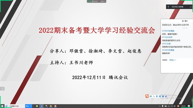 鑒于新生們反映學習壓力大、學習和生活中感到迷茫的普遍情況,語言文化與傳媒學院特地組織了一場2022期末備考暨大學學習經驗交流會。此次交流會于20221211日晚上七點在騰訊會議云端進行,由22級新聞學(2)班班主任王書川老師主持。王老師邀請了20級新聞學專業鄧傲雪、徐湘琦及21級網絡與新媒體專業李文雪、趙俊惠等4名優秀的高年級同學為大家做交流分享,22級各班新生120余人聞訊后參會。