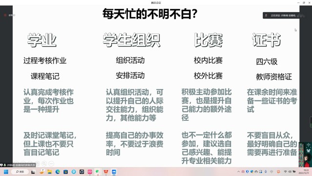 王老師向同學們簡要介紹了4位學姐,在她們經驗分享后作了內容小結,并設置了線上自由提問的環節。經驗分享環節中,第一位交流經驗的是20級新聞學鄧傲雪。她著重從備考背書技巧方面展開,建議期末背書時將任務量化,每日做好背書的大致規劃,可以集中整體時間攻克一門課程,也可以嘗試大聲朗讀背書內容并進行勾畫以強化記憶。其次分享經驗的是20級新聞學徐湘琦。她主要從學習、生活、期末三個方面細說,建議同學們平時學習中在認真聽課的同時也要多去實踐,提高能力和辦事效率。同時,大一是一個不斷適應的時期,生活中同學們可以多出去看看外面的世界,以此來開拓眼界。第三位給出建議的是21級網絡與新媒體專業李文雪。她強調學習筆記不可拖拉,平時生活中可以多培養正向的愛好,積極參加與自己專業有關的比賽等,并且以幽默風趣的口吻講述了自己同學的經歷,借此來告訴同學們一定得記清考試時間等重要信息。最后一位交流經驗的是21級網絡與新媒體專業趙俊惠,她分別從期末備考、平時學習、大學學習規劃、結尾祝福四個方面結合自身提出建議,如每門課可以建立備忘錄,弄清楚老師的考核方式,帶著目標去學。她還指出筆記不要盲目照抄PPT的內容,要有自己的理解,這樣可以增強記憶。