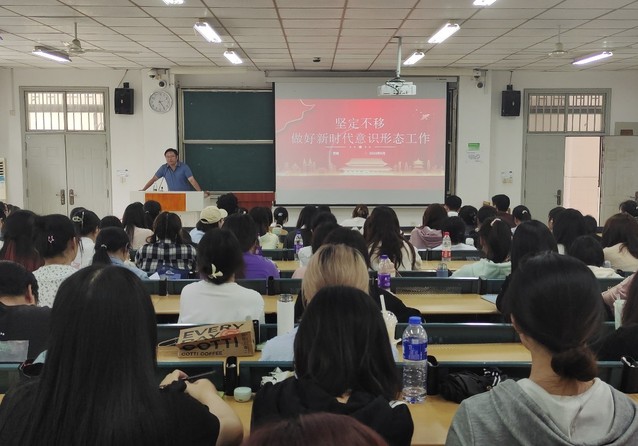 523日下午,語言文化與傳媒學(xué)院2023年入黨積極分子培訓(xùn)班第三次理論授課在一區(qū)善思樓A101教室舉行。本次黨課由校黨委委員、宣傳(統(tǒng)戰(zhàn))部部長(zhǎng)賈峰主講,題目為“堅(jiān)定不移做好新時(shí)代意識(shí)形態(tài)工作”,我院及旅游與會(huì)展學(xué)院本期入黨積極分子培訓(xùn)班學(xué)員參加,黨課由語言文化與傳媒學(xué)院黨委書記儲(chǔ)昭輝主持。
