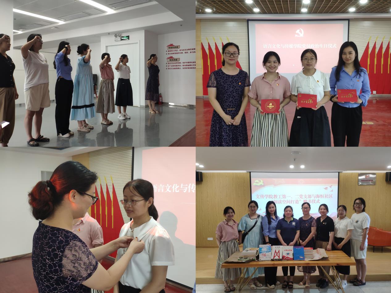 為慶祝中國共產(chǎn)黨成立102周年,增強黨性教育,74日下午,語言文化與傳媒學(xué)院教工第一、二黨支部前往海恒社區(qū)進行主題黨日活動。此次活動有兩項議程:一是在海恒社區(qū)進行閱讀推廣活動,二是為支部黨員過政治生日、重溫入黨誓詞。