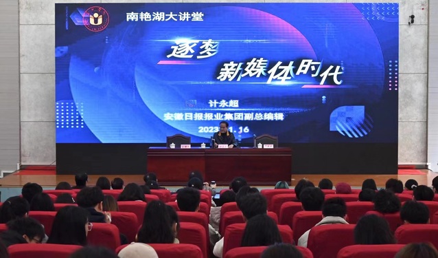 1116日下午三點,由合肥學院科研處、語言文化與傳媒學院主辦的南艷湖大講堂學術報告在圖書館報告廳B廳順利舉行。本次活動邀請了安徽日報報業集團副總編輯計永超做題為“逐夢新媒體時代”的學術講座。講座由語言文化與傳媒學院院長丁增武教授主持,合肥學院校長吳春梅教授致歡迎辭。語言文化與傳媒學院黨委書記儲昭輝,副書記張愛萍,副院長殷明明、查金萍以及150余位新聞傳播學專業師生共同參與此次講座。