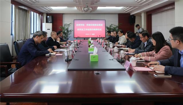 黨委研究生工作部部長、研究生處處長葛春梅與安徽日報報業集團人事處處長張擎分別代表合作雙方簽署共建研究生工作站框架協議,吳春梅與范榮暉共同為研究生工作站揭牌。