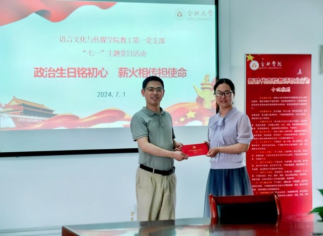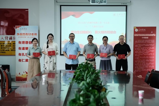為慶祝中國共產黨成立103周年,進一步增強黨員的政治榮譽感、責任感與歸屬感,推進黨紀學習教育走深走實,7月1日,語言文化與傳媒學院教工第一黨支部開展黨員集體過“政治生日”主題黨日活動。活動由黨支部書記洪婧主持,支部全體黨員參加。
